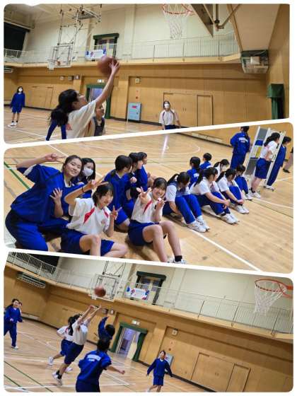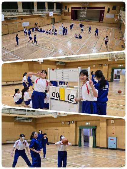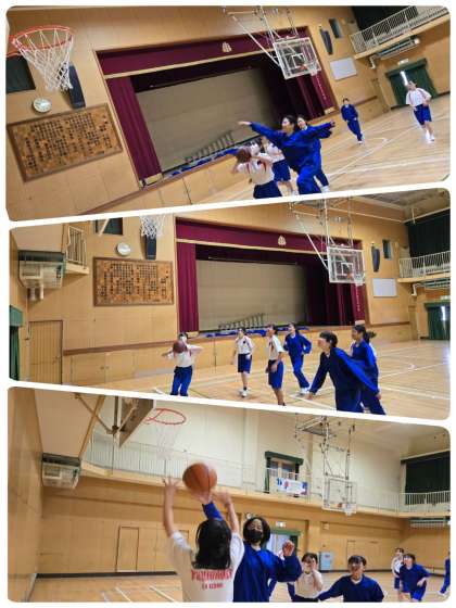バスケットボールの試合をしています。みなさん積極的に動いています。