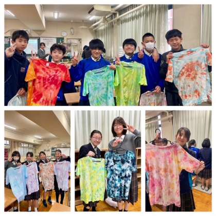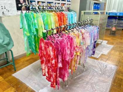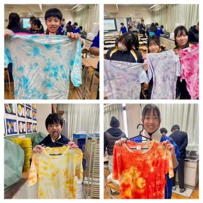 自分が出したい模様によってTシャツの絞り方を変え、染料を混ぜて自分だけの色を作りました。色と色の組み合わせや余白のバランスを考えながら染めました。全クラス染めることができたので、次はステンシルでオリジナルロゴを印刷していきます。
