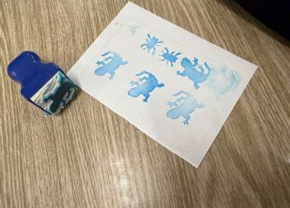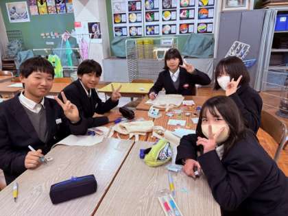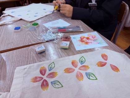 消しゴムハンコに布用インクをつけてトートバッグにおしています。普段の生活に美術が深く関わっていることを知り、模様に思いを込めながら進めています。