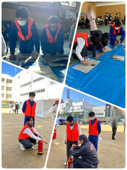 桃陽小学校で開催された桃陽防災フェスタに行ってきました。本校からはボランティアスタッフとして3名の生徒が参加しました。新聞紙スリッパ製作体験の運営を任せられ、来場者の方に新聞紙スリッパの作り方を教えていました。