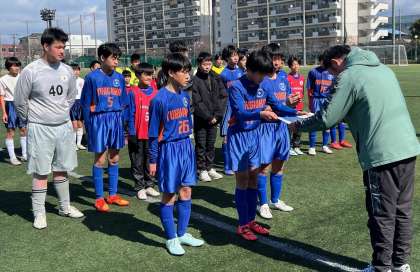 大阪市サッカー連盟主催の市会議長杯、3位決定戦が南津守さくら公園で行われました。今市中学校と対戦し、立ち上がりから良い形で攻撃をし、相手ゴールに迫り先制をしました。後半も追加点を重ね、3-0で勝つことができました。秋から始まったリーグ戦を勝ち抜き、決勝トーナメントでもクラブチーム相手に引くことなく戦い、大会を通してチームとして成長できました。今後も自分達の目標を見失うことなく、春に向けてさらにレベルアップできるよう、日々のトレーニングから基準をあげていきましょう。