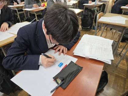 学年末テストが返却されました。みなさん振り返りをおこなっています。
