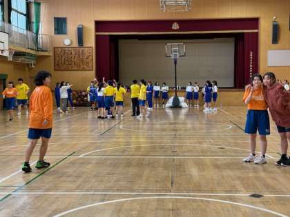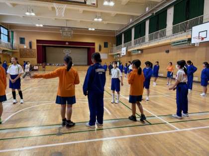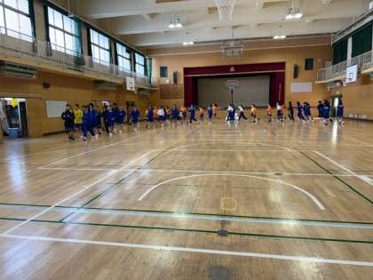 体育館では、女子バスケットボール部が練習に励んでいました。練習では、上級生が新入生に対して優しく丁寧に指導する姿が見られ、温かく協力的な雰囲気の中で活動が行われていました。