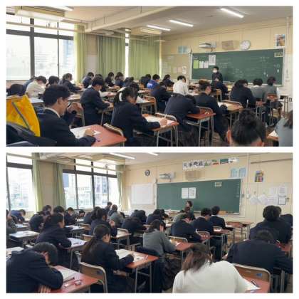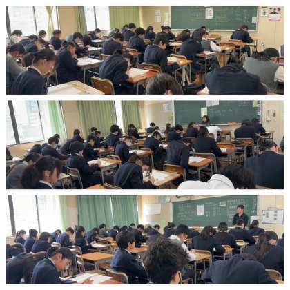 本日、3年生を対象に全国学力・学習状況調査が実施されました。国語・数学の筆記調査、生徒質問紙調査に加えて、理科は端末を使用したデジタル形式で行われました。生徒たちは真剣な表情で取り組んでいました。