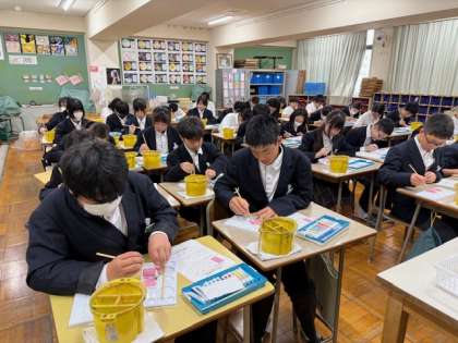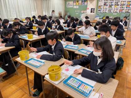 絵の具の授業が始まりました。基本となる塗り方を身につけて、塗りむらなく塗っていきます、
