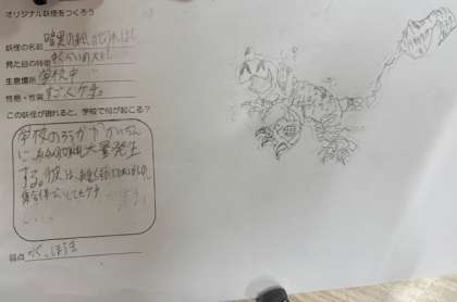 美術部では、ただいま「オリジナル妖怪づくり」に取り組んでいます。今はアイデアスケッチの段階ですが、個性豊かでユニークな発想がたくさん生まれています。