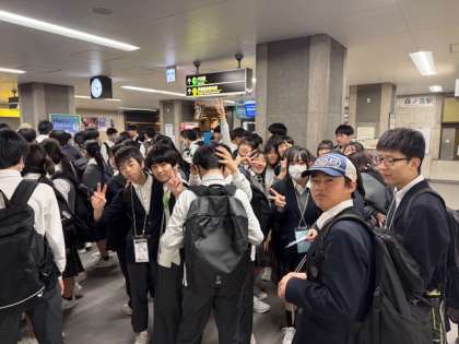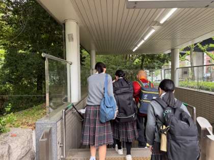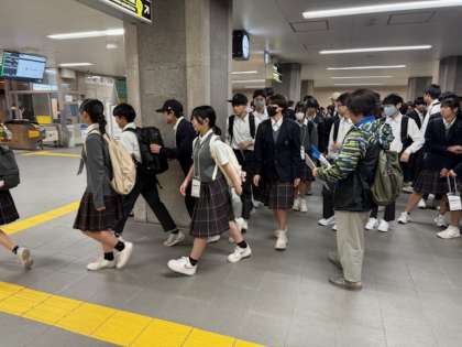 森ノ宮駅から、いよいよ専用列車に乗り込みます。ルールやマナーを守って、安全に夢洲を目指します。