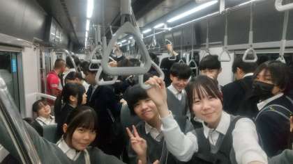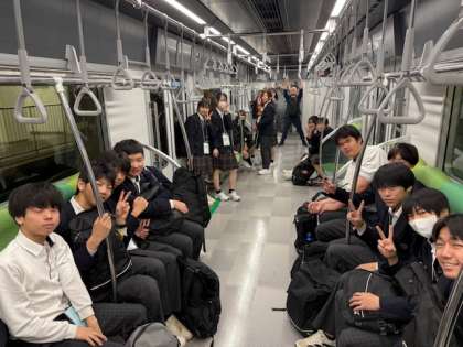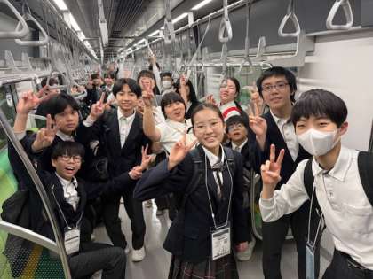 電車の車内は、大阪・関西万博への期待でいっぱいです。