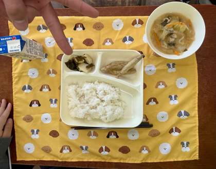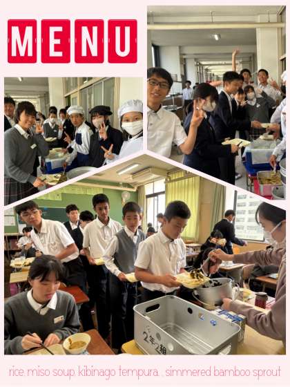 ごはん、みそ汁、きびなごの天ぷら、若竹煮です?