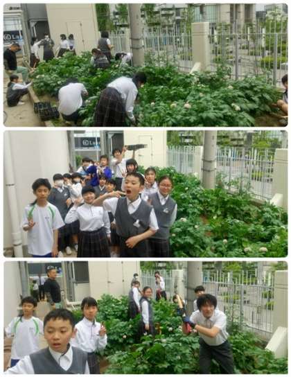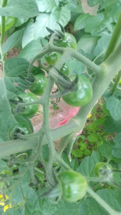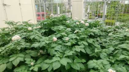 じゃがいもの花が咲いて、ミニトマトも実がついてきました。
