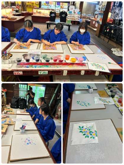 ?加賀の友禅伝統技法で型染め体験をし、自分だけの模様に染め、ハンカチを作りました。