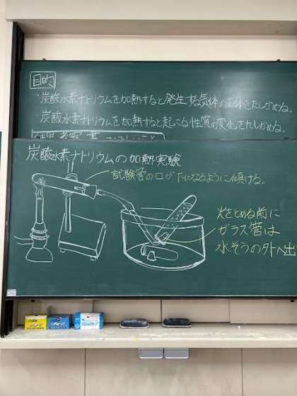 炭酸水素ナトリウムの熱分解で、色の変化を見たり火を近づけたり試薬を滴下したり。