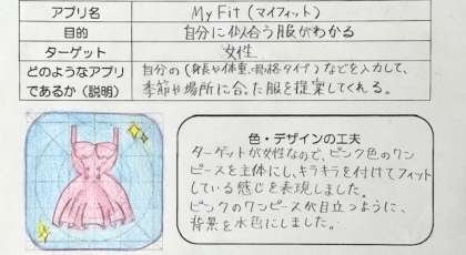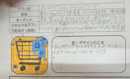 アプリのデザインの授業です。AIのデザイン会社に務める同僚との対話で主題を深め、班活動で意見交流をしています。アイデアスケッチでは、なぜその色や形にしたのか理由をしっかり書きます。パッと見て伝わるデザインになっているかどうかが大切です。