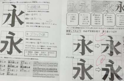 明朝体とゴシック体の「永」の練習が終わった後は、違う漢字を練習しています。みなさん書体の特徴を理解して表現できています。テスト当日もレタリングの実技があります。がんばろう!