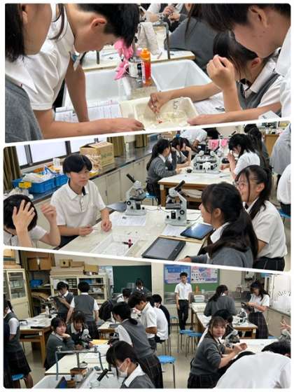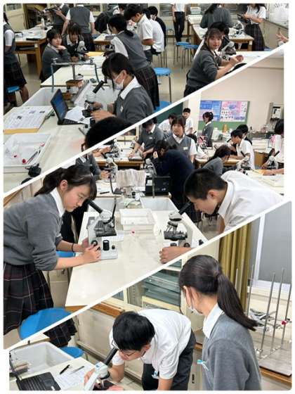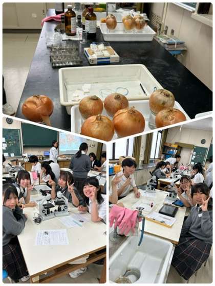 タマネギの根の先端部分をほぐして、染色液をかけ、細胞分裂の様子を顕微鏡で観察しています。