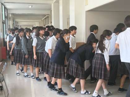 本日、1階理科室からの火災発生を想定した避難訓練を行いました。先生の指示をよく聞きながら、全員が落ち着いて行動し、5分以内にグラウンドまで避難することができました。今回の訓練を通して、「自分の命を守る行動」や「非常時の落ち着いた判断と行動」の大切さを改めて学ぶことができました。今後も万が一の事態に備えて、日頃から安全意識を高めていきましょう。