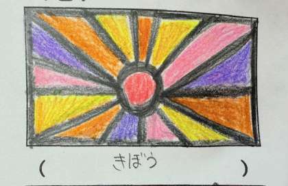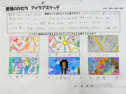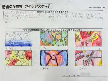 アイデアが完成しました。目に見えない感情を色や形を工夫して表現しています。抽象表現は難しそうですが、友達の作品を見たり、班で話し合うと、表現の幅が広がっていき、それを自分の作品にいかしていっている人達が多いです。