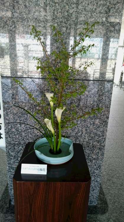 白い花は「カラー」、太い枝は「錦木(ニシキギ)」、細い葉は「カンスゲ」という名前です。