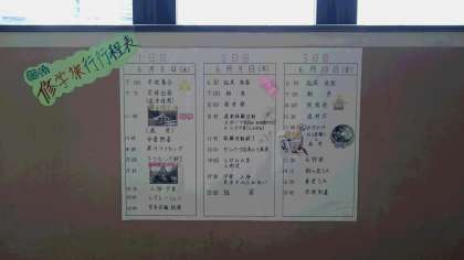 修学旅行まで約1ヶ月となり、3年生では修学旅行に向けての準備が着々と進んでいます。多くの人が修学旅行委員に立候補し、思い出に残る修学旅行にしようと積極的に取り組んでいます。廊下には、調べたことや行程表を張り出し、修学旅行を成功させるのだという気運を高めています。