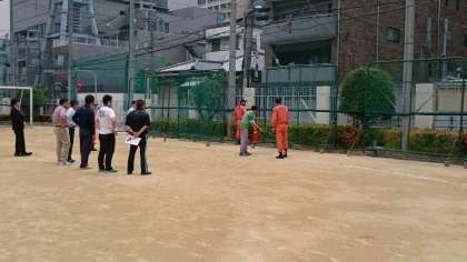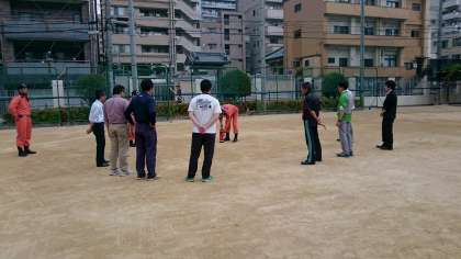 訓練終了後、先生方が消防署の方より消火器の使い方の講習を受け、消火訓練を実施しました。