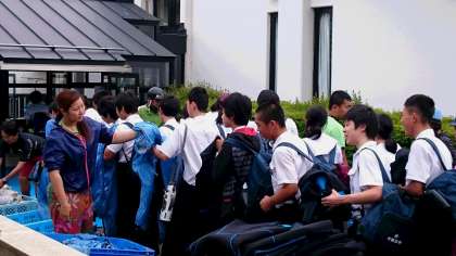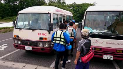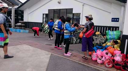 ラフティングのベースに到着です。ウェットスーツ、ヘルメット、ライフジャケットをもらい、準備完了です。バスに乗り込んで、会場までGo