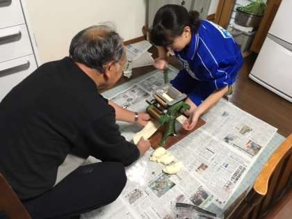 こねたうどんを製麺機にかけ伸ばす作業をしました。