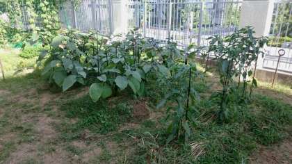 園芸部が菜園で夏野菜を栽培しています。