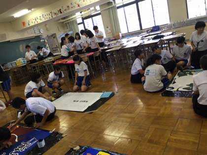 投票で選ばれた生徒の絵を大きな布に下書きし、色付けをしていきます。