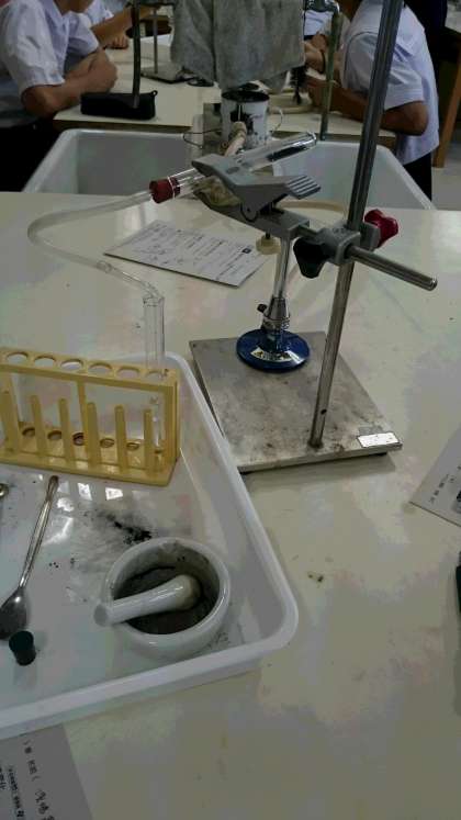 本時は、酸化銅と活性炭を混ぜ合わせたものを試験管に入れて加熱し、銅を取り出す実験です。どの班も慎重に作業を進めながら、物質の変化を観察しています。