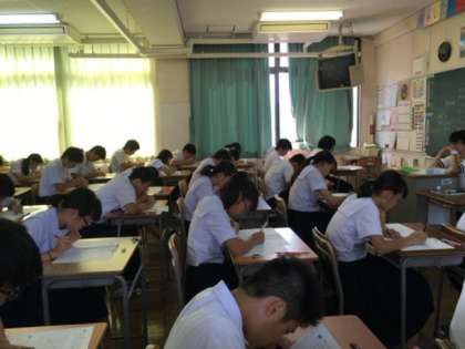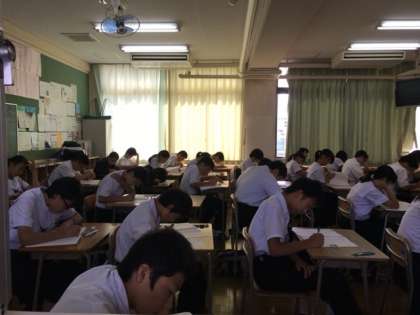 国語・社会・数学・理科・英語の5教科のテストです。皆、真剣な表情で問題に取り組んでいます。