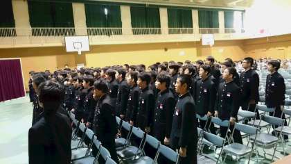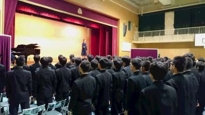 本日は各学年の課題曲の発表会となっています。まずは2年生から。全員合唱で発生練習です。