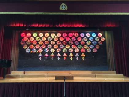 今回舞台の背景に飾られている、トライアングルデザインは生徒一人一人が『自分自身』をテーマに書き上げた三角形の絵を組み合わせて作られています。