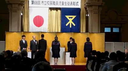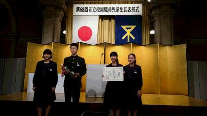 その功績が本日、表彰されました。中央公会堂の表彰式には前期生徒会中央委員の4名が参加しました。