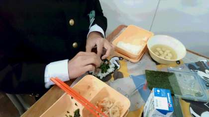 今日の献立は手巻き寿司。正月の行事献立です。同じ具材なのに生徒それぞれ巻き方が違います。みんな美味しそう。