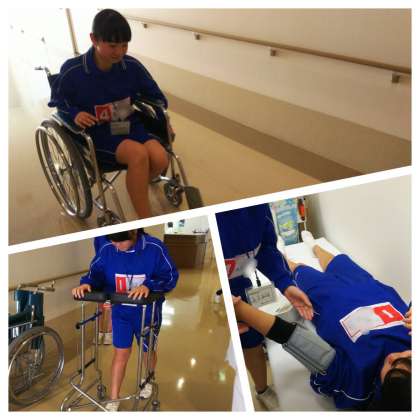 病院では車椅子体験やリハビリ体験、血圧測定中