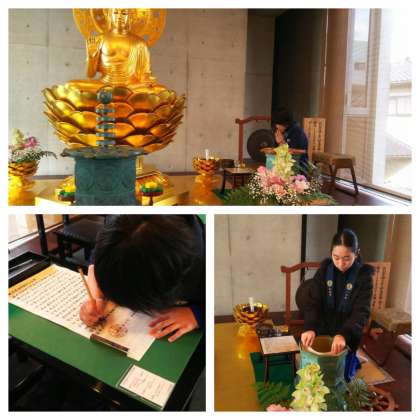 お寺で写経やお祈り中