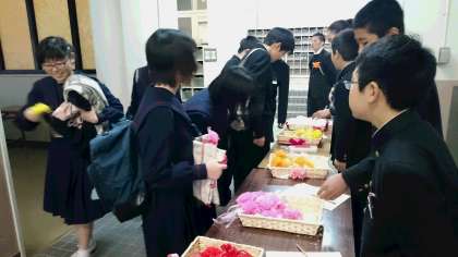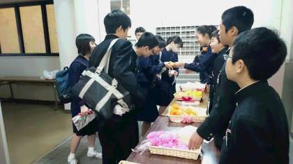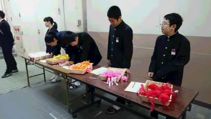 生徒会役員からコサージュを受け取り胸につけます。