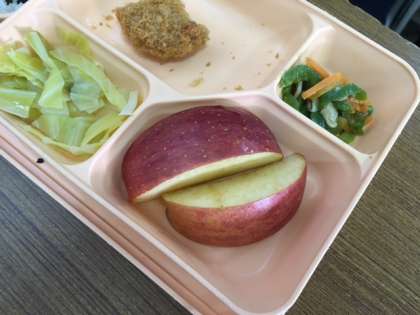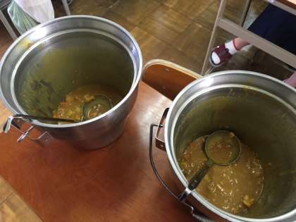 副食容器に入ったミンチカツをカレーにのせていただきます。