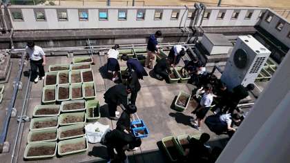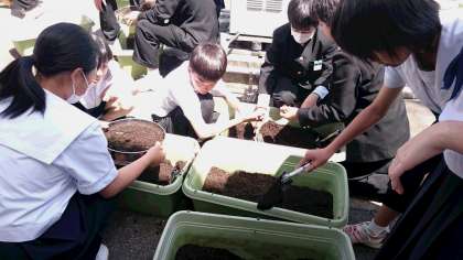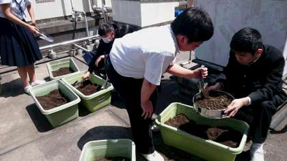 技術の授業は栽培の分野です。今日は土作り。収穫の秋が楽しみです。