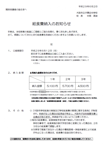 給食費納入のお知らせ