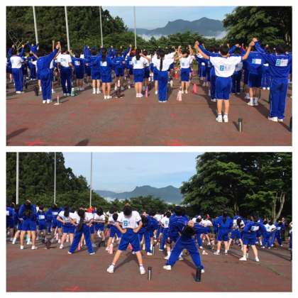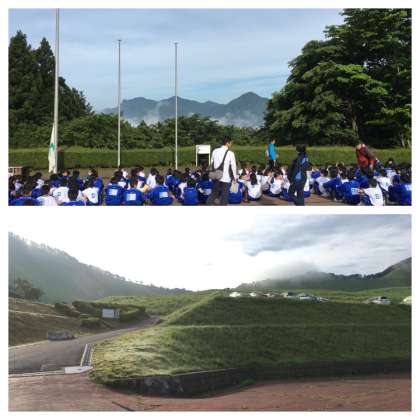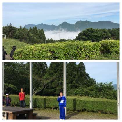 青空の下、爽やかな風を感じながら山のおいしい空気を吸って、ラジオ体操をしました。