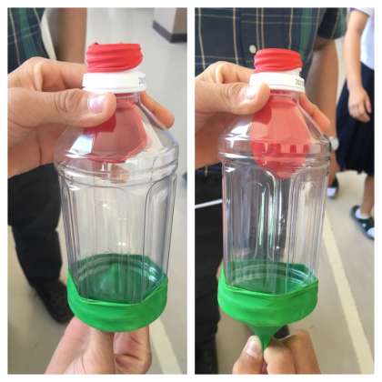 またペットボトルと風船を肺に見立ててた装置を使って、呼吸と肺の動きの関係について学びました。