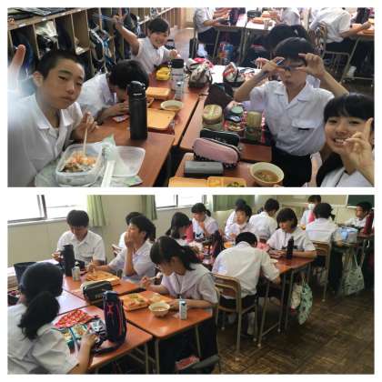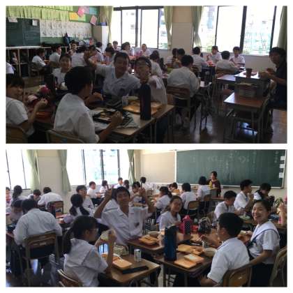 班メンバーで向かい合って楽しそうに食べています。