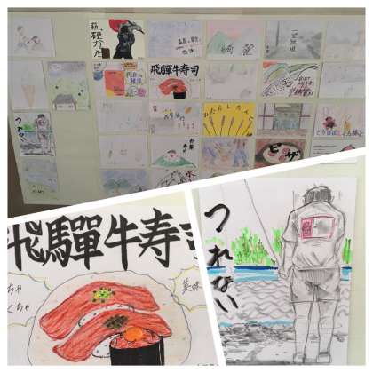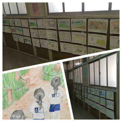 1年生と3年生の廊下には一泊移住の絵と修学旅行の絵葉書が掲示してあります。