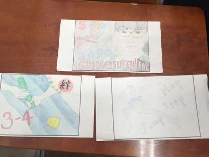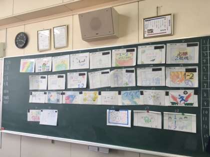 夏休みの宿題で描いた図案を見ながら学級旗を決めていきます。