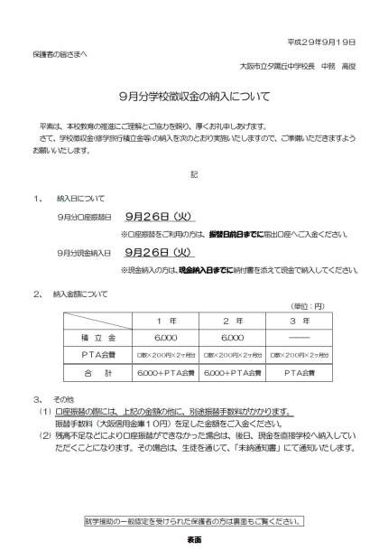 9月分学校徴収金の納入について