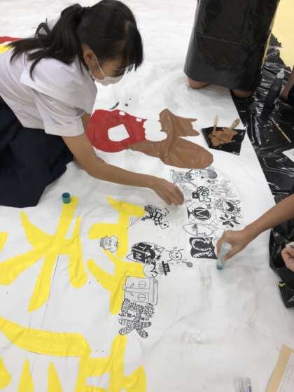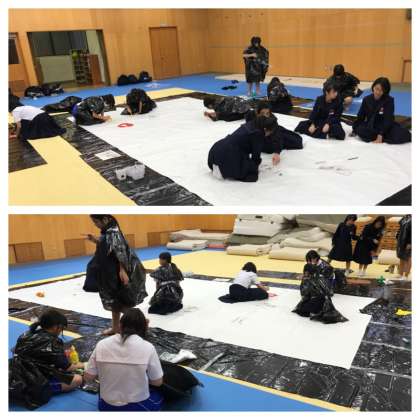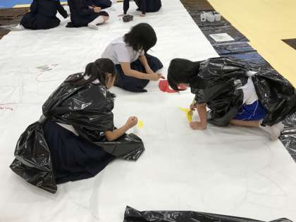 夏休みに全校生徒一人一人が考えた自分のシンボルマークを貼り合わせて、完成させていきます。