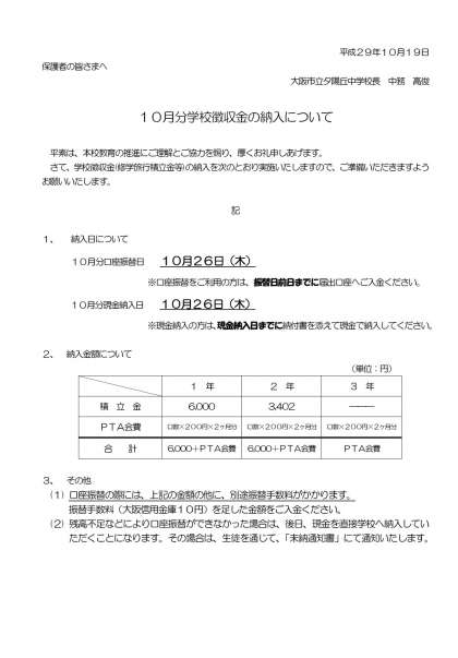 前日の10月25日(水)までに学校届出口座(大阪信用金庫)へご入金くださいますようお願いいたします。
