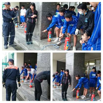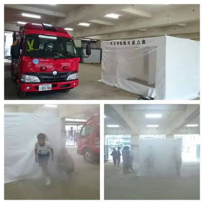 体育館でお話しを伺った後は、水消火器による放水訓練、けむりテントの体験です。