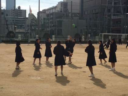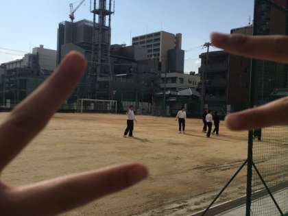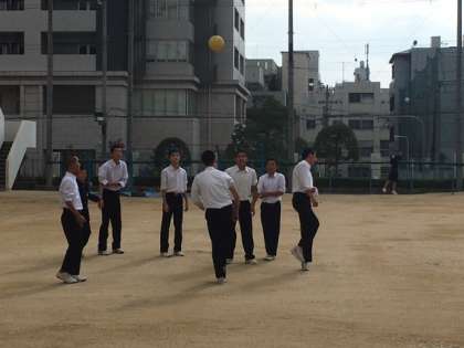 2年生が運動場でサッカーやバレーボールをして、元気に遊んでいます。